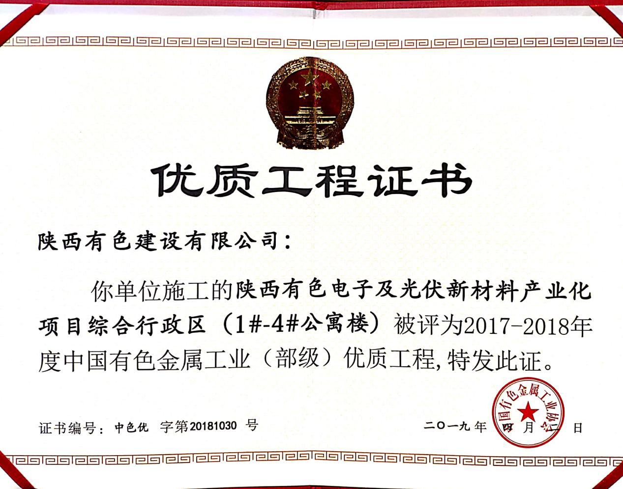 6月11日中國有色金屬工業協會召開2019年度有色金屬工業建設工程質量監督工作會議,表彰2017-2018年度中國有色金屬工業(部級)優質工程。公司承建的陜西有色電子及光伏新材料產業化項目綜合行政區Ⅰ標段:1#-4#公寓樓,綜合行政區Ⅱ標段:辦公樓、職工餐廳、文體中心項目被評為2017-2018年度中國有色金屬工業(部級)優質工程。